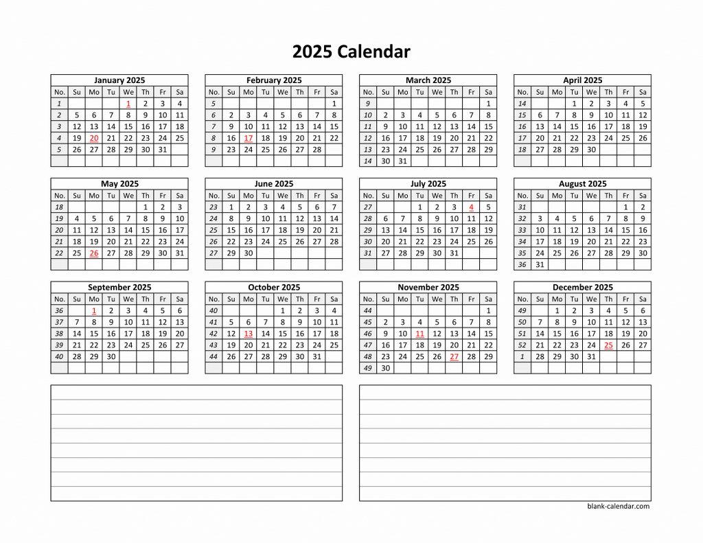 Yearly 2025 Calendars with regard to 2025 Calendar Printable with Notes