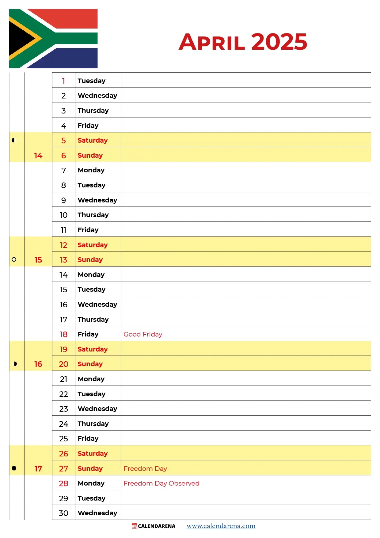 April 2025 Calendar South Africa Printable – Are you ready to dive into the delightful month of April 2025? Look no further than our South Africa Printable Calendar to help you make the most of your month! With charming illustrations and vibrant colors, our calendar is not only practical but also a feast for the eyes. Whether you’re planning your work schedule, organizing family events, or simply looking to stay on top of your daily tasks, our April 2025 Calendar has got you covered with style and flair.