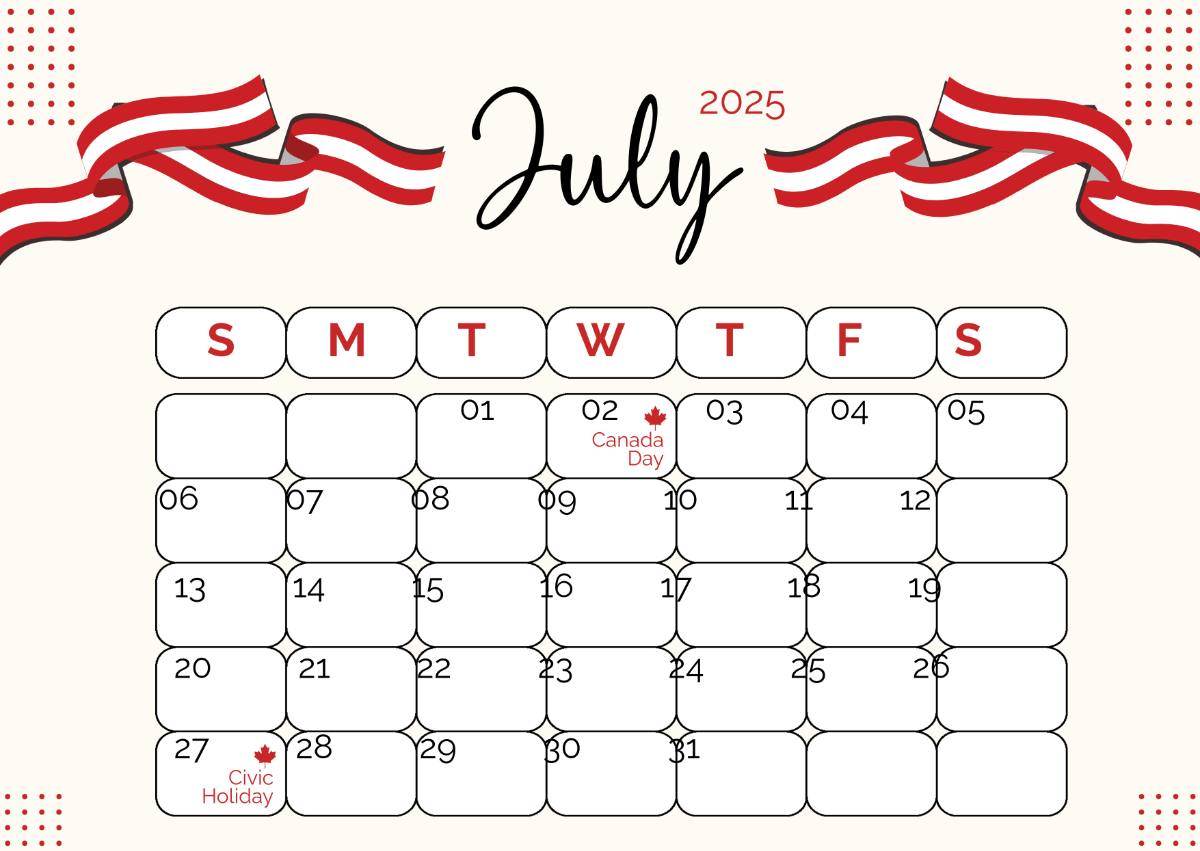 July 2025 Canada Calendar Printable – Summer is finally here, and what better way to kick off the season than with a July 2025 Canada calendar printable! With vibrant colors, fun illustrations, and plenty of space to jot down all of your exciting plans, this calendar is sure to add a touch of sparkle to your summer. Whether you’re looking forward to beach days, BBQs, or exploring the great outdoors, this calendar will help you stay organized and make the most of the sunny days ahead.