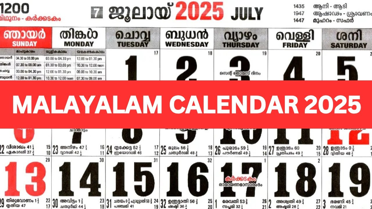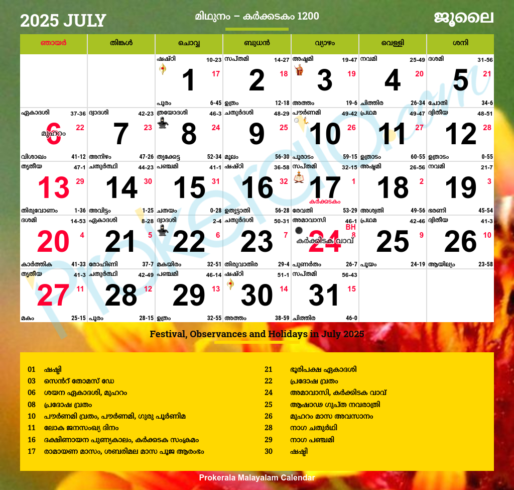 July Calendar 2025 Malayalam – July is here, and with it comes a month filled with jubilation and festivities in the Malayalam calendar for the year 2025. From vibrant cultural celebrations to religious ceremonies, July is set to be a month to remember. Get ready to immerse yourself in the rich traditions and colorful events that await you in this exciting month.