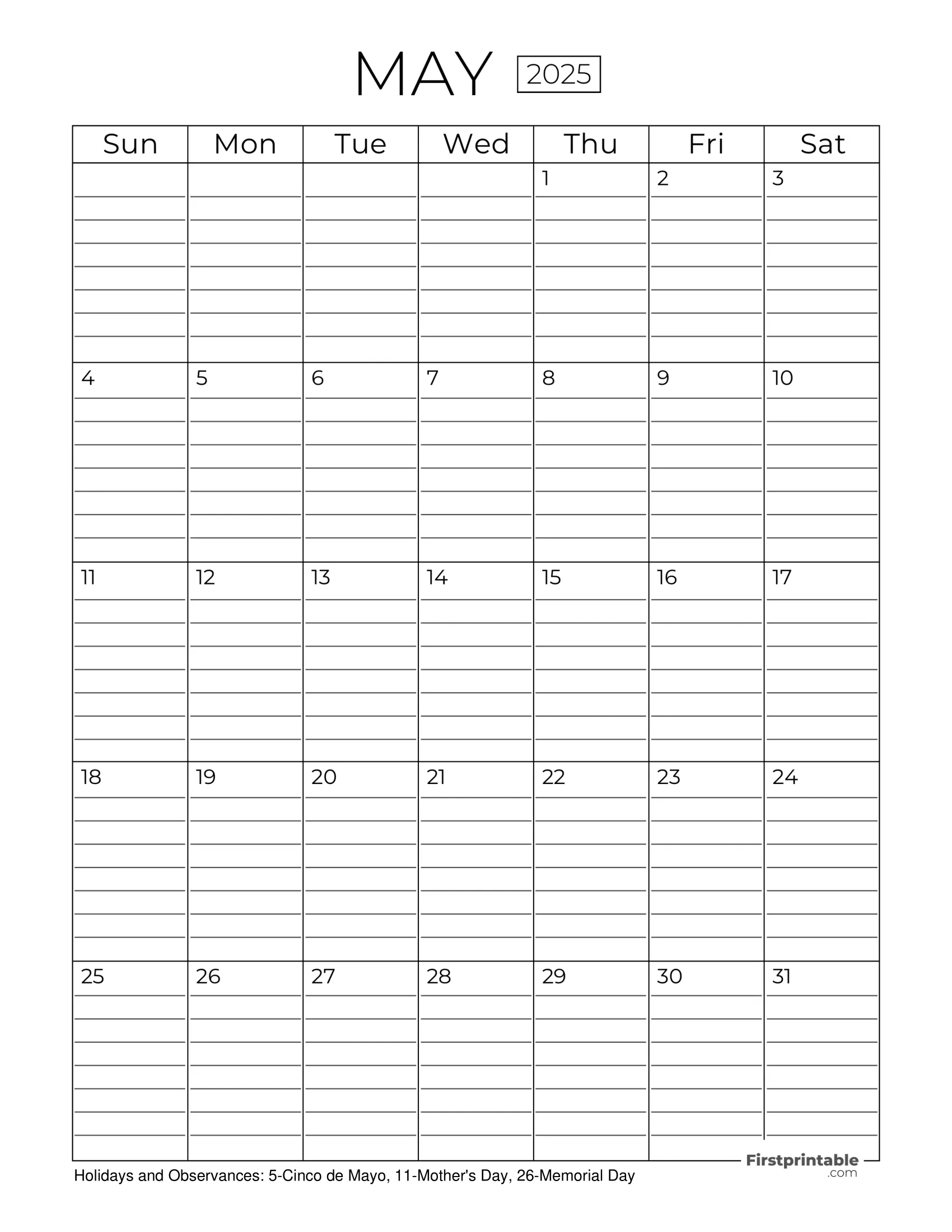 Printable May 2025 Calendar with Lines – Welcome to the month of May 2025! As we dive into a new month filled with endless opportunities, it’s important to stay organized and stylish with the May 2025 calendar with lines. This calendar not only helps you keep track of important dates and appointments, but it also adds a touch of style to your planning routine. With its sleek design and practical layout, the May 2025 calendar with lines is the perfect tool to help you stay on top of your busy schedule while looking fashionable at the same time.