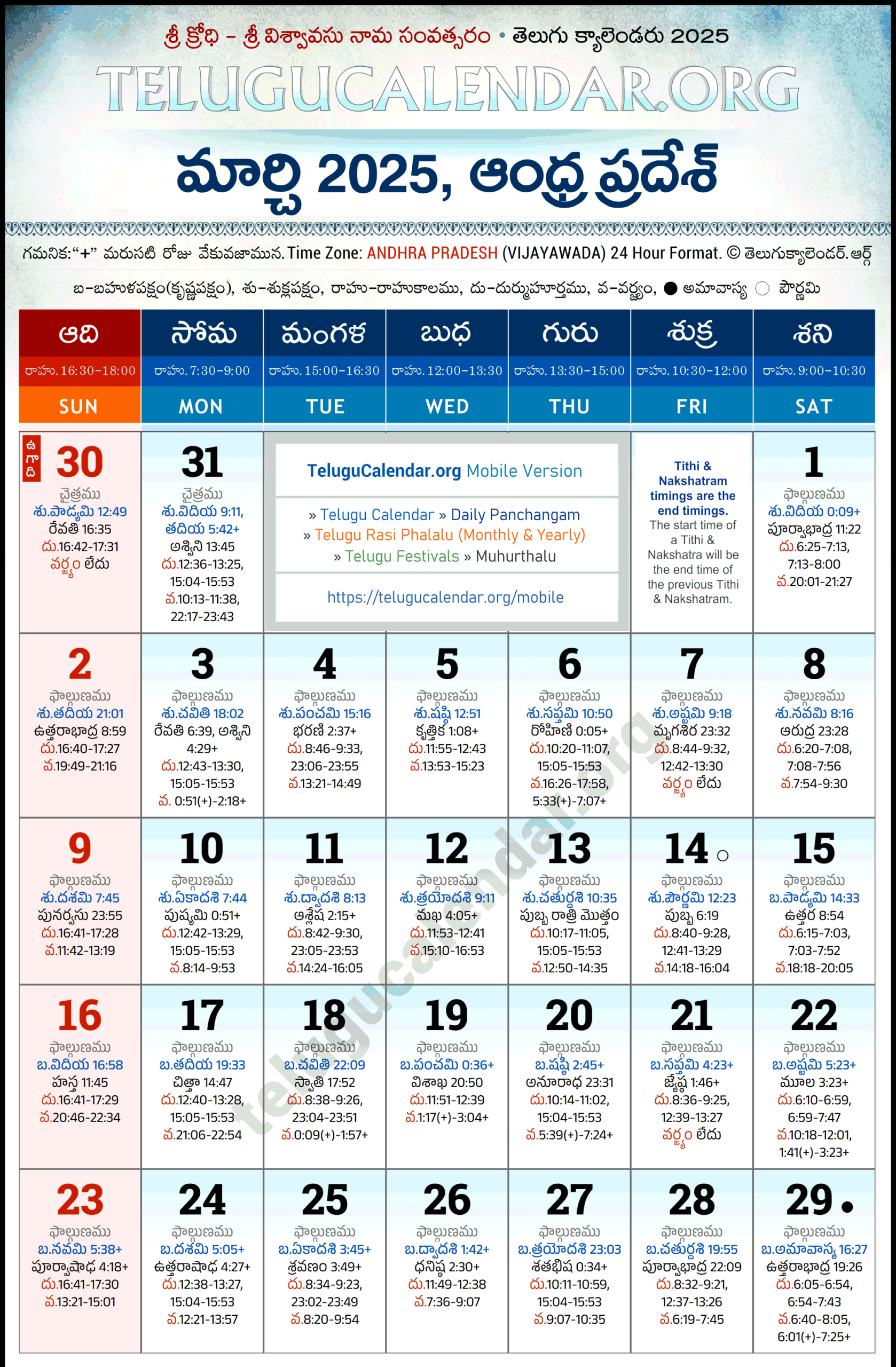 Telugu Calendar March 2025 – Spring is a time of renewal and rejuvenation, and what better way to welcome this season of growth and new beginnings than by diving into the colorful world of the Telugu Calendar 2025? With its rich cultural heritage and vibrant traditions, the Telugu calendar is a treasure trove of festivals and celebrations that are sure to fill your days with joy and excitement. From Ugadi, the Telugu New Year, to the colorful Holi festival, there are countless reasons to embrace the spirit of spring with the Telugu calendar 2025.